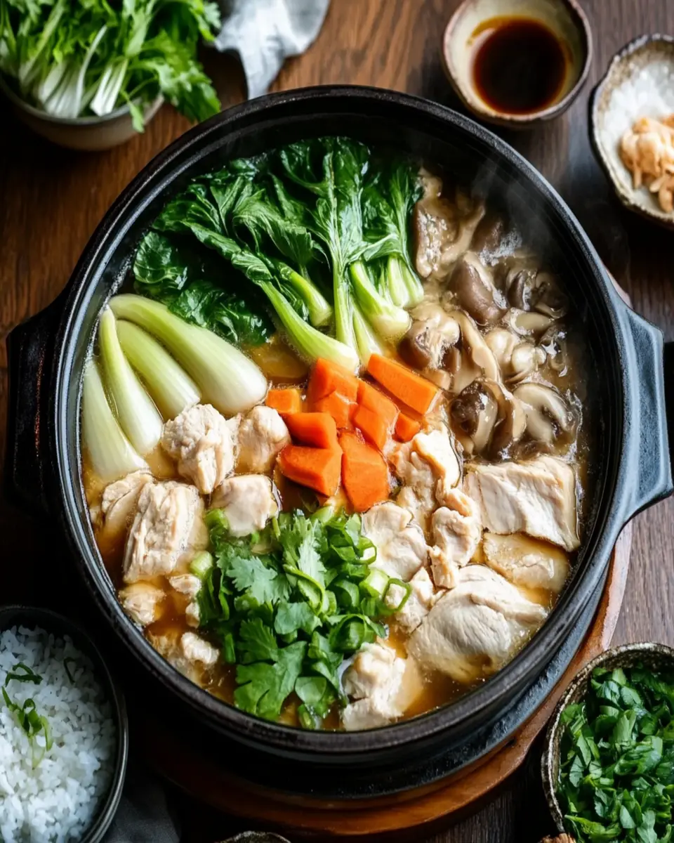 A warm and comforting Japanese hot pot dish featuring chicken and fresh vegetables.