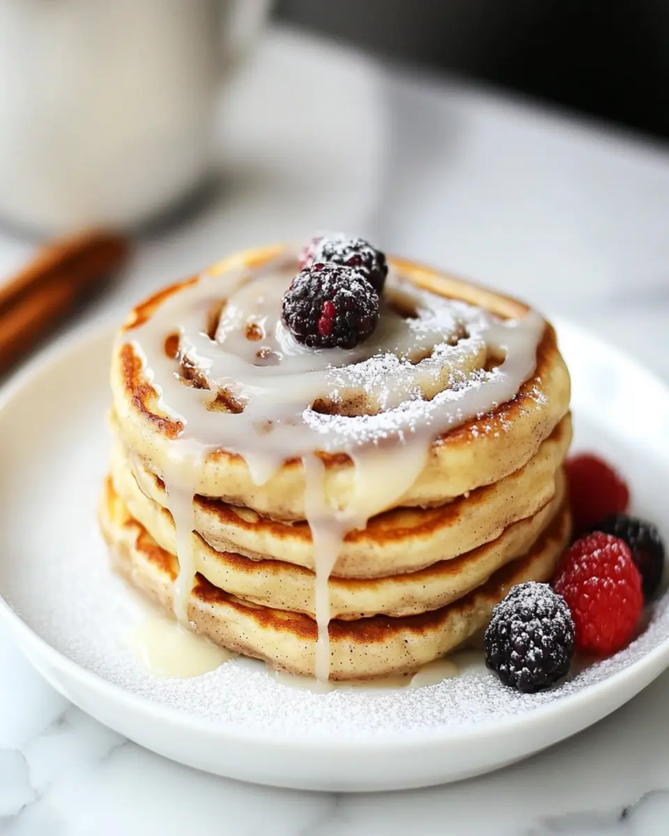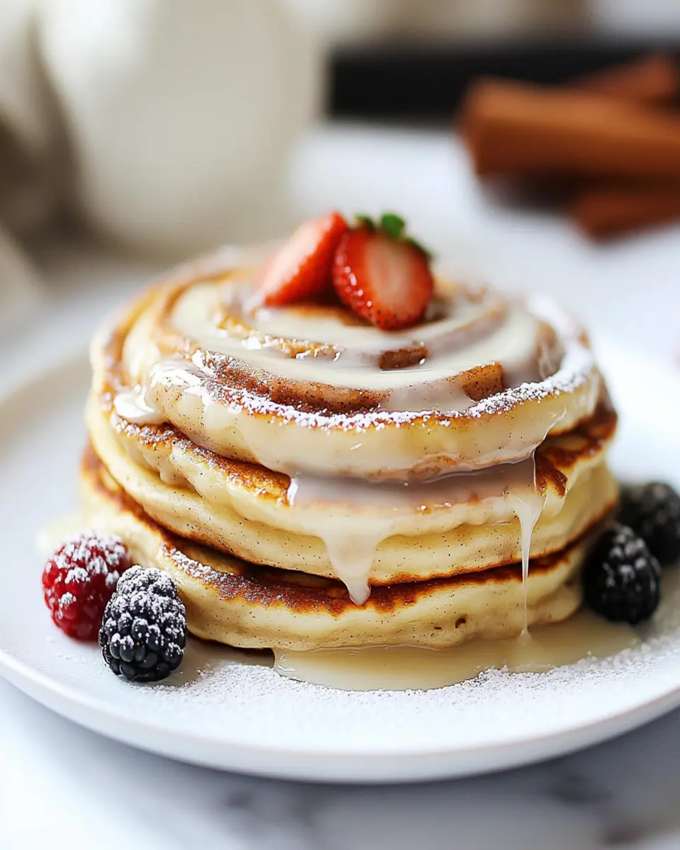 Delicious cinnamon roll pancakes topped with cream cheese icing, combining the flavors of a classic cinnamon roll in a fluffy pancake form.