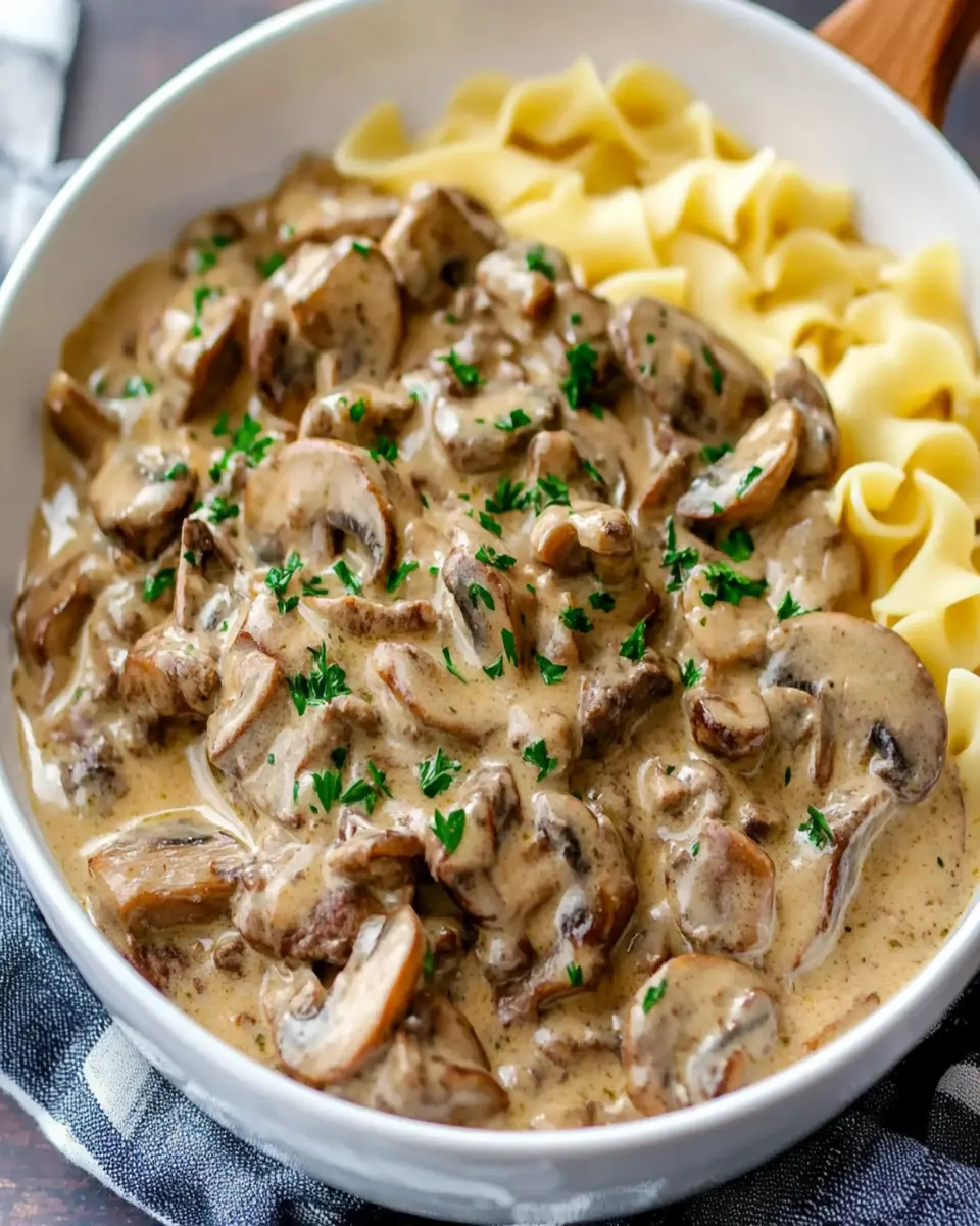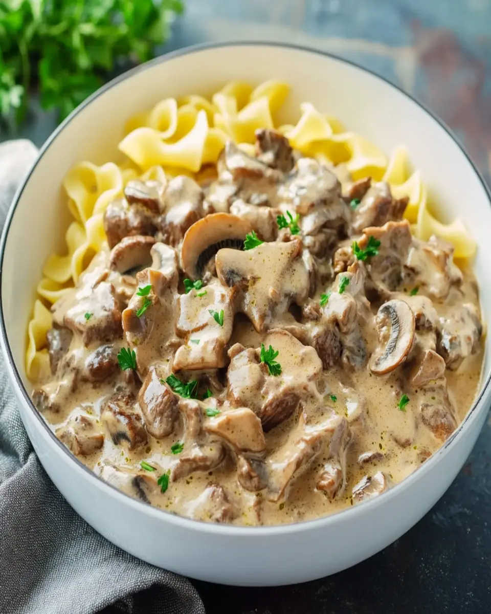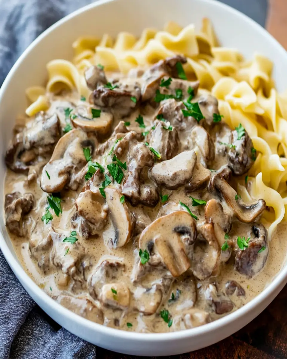 A deliciously creamy and hearty beef stroganoff with savory mushrooms, perfect served over egg noodles.