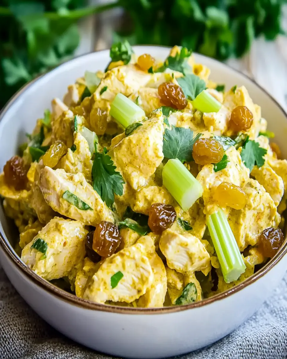 A delightful and flavorful salad that combines chicken, raisins, and a touch of curry for a unique twist.