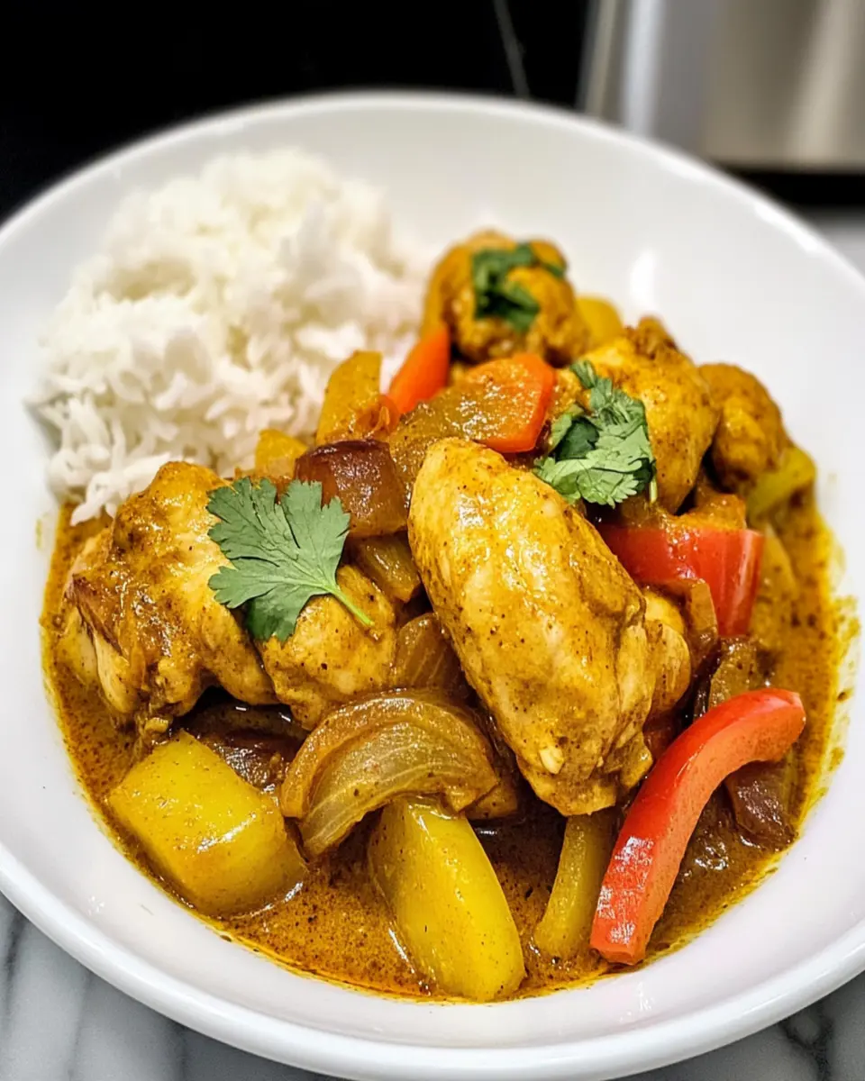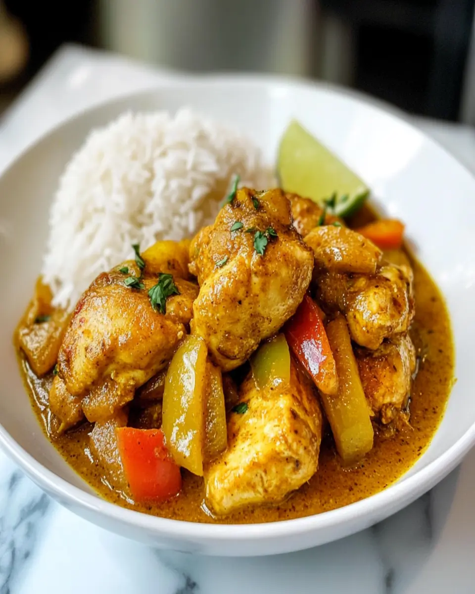 Jamaican Curry Chicken is best enjoyed hot, served alongside fluffy rice or warm bread, allowing you to soak up the delicious sauce. The creaminess of the coconut milk combined with the spices creates a delightful contrast that pairs wonderfully with a side of steamed vegetables or a fresh salad.